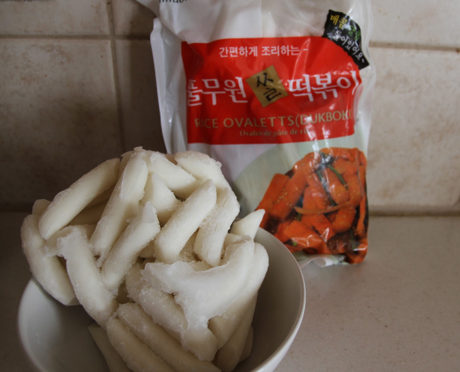 Bánh gạo ,                                                      Tiếng Hàn : 떡볶이 (Ddot-bok-gi)               Tiếng Anh: Rice cake.                                    Bánh gạo có dạng thon dài như trong hình dùng cho món Ddot bok gi. Cũng có loai bánh gạp dạng miếng thì dùng nấu súp.