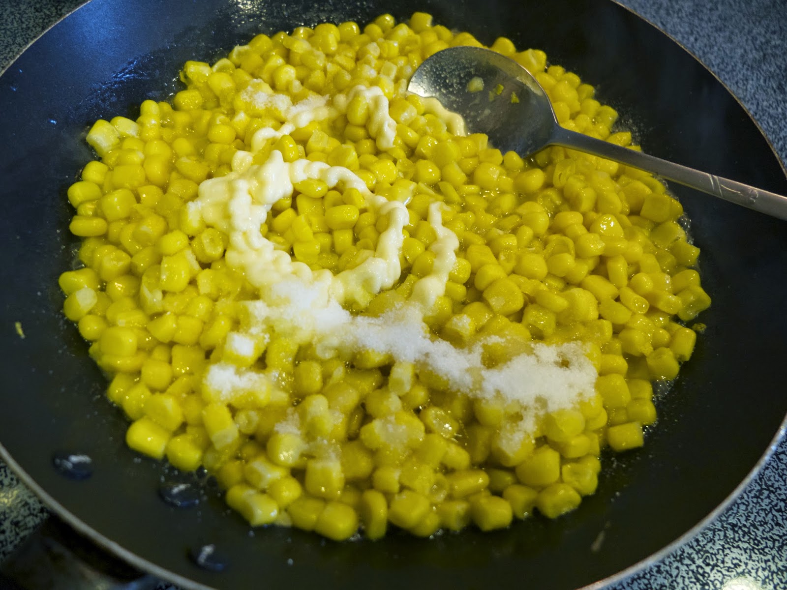 Xào sơ chừng 2 phút thì cho 1 muỗng canh sốt Mayonaise, 1 muỗng cafê đường vào . Đảo đều thêm 1-2 phút nữa rồi đổ ra chảo gang. (hoặc khay bằng nhôm bán sẵn ở chợ Mỹ, hoặc khay bằng sứ)