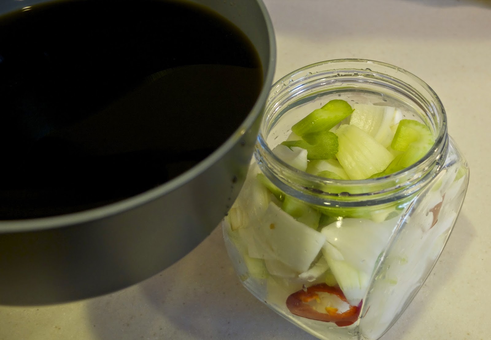 Nước sốt để nguội rồi cho vào keo. Để vào tủ lạnh. Sau 2 ngày đã có thể ăn được. Củ hành lúc đó sẽ không còn muì hăng , cay, mà vị sẽ chua ngọt vừa phải, mặn mặn của nước tương, giòn ngọt có thể so sánh như vị củ kiệu . P thích cho ớt sừng và cần tây vào ngâm chung. Nước sốt ra vị rất thơm. Cùng với công thức nước sốt như vầy, các bạn có thể áp dụng với tỏi. Tỏi mua về lột vỏ, để nguyên tép rồi làm y như vầy thôi.