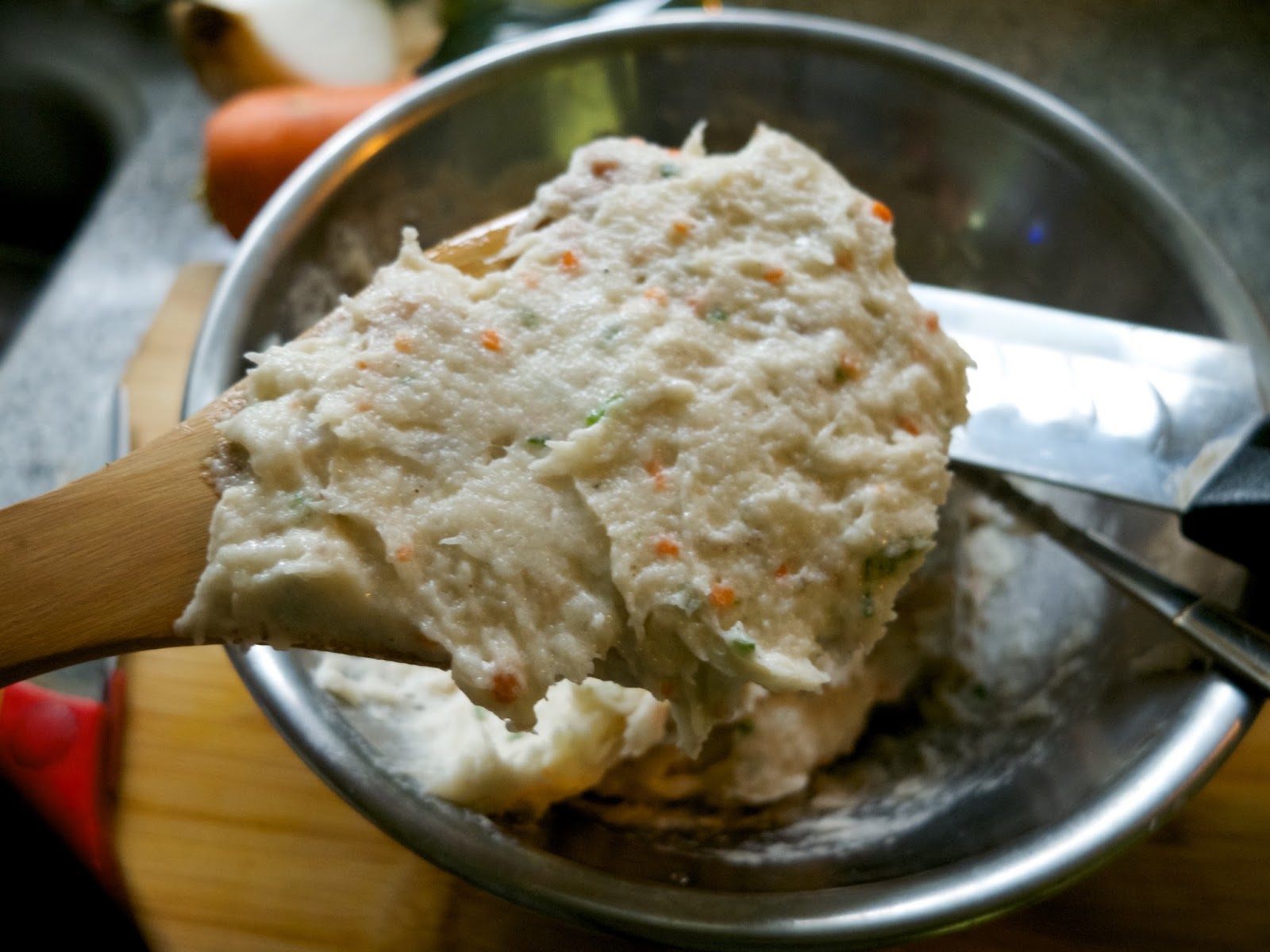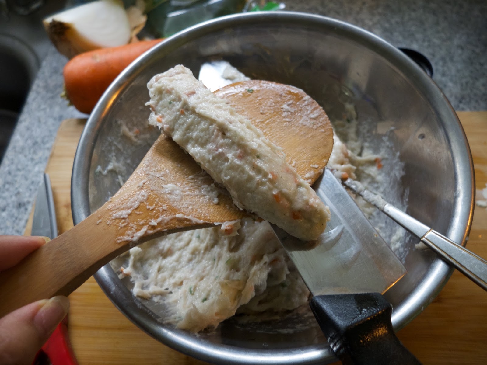 – Mực xắt hạt lựu nhỏ cho dễ xay. Cá và tôm thì chỉ cần xắt quân cờ nhỏ. (tuỳ máy xay mạnh hay yếu, tất nhiên nếu được nên xắt nhuyễn mọi thứ)
