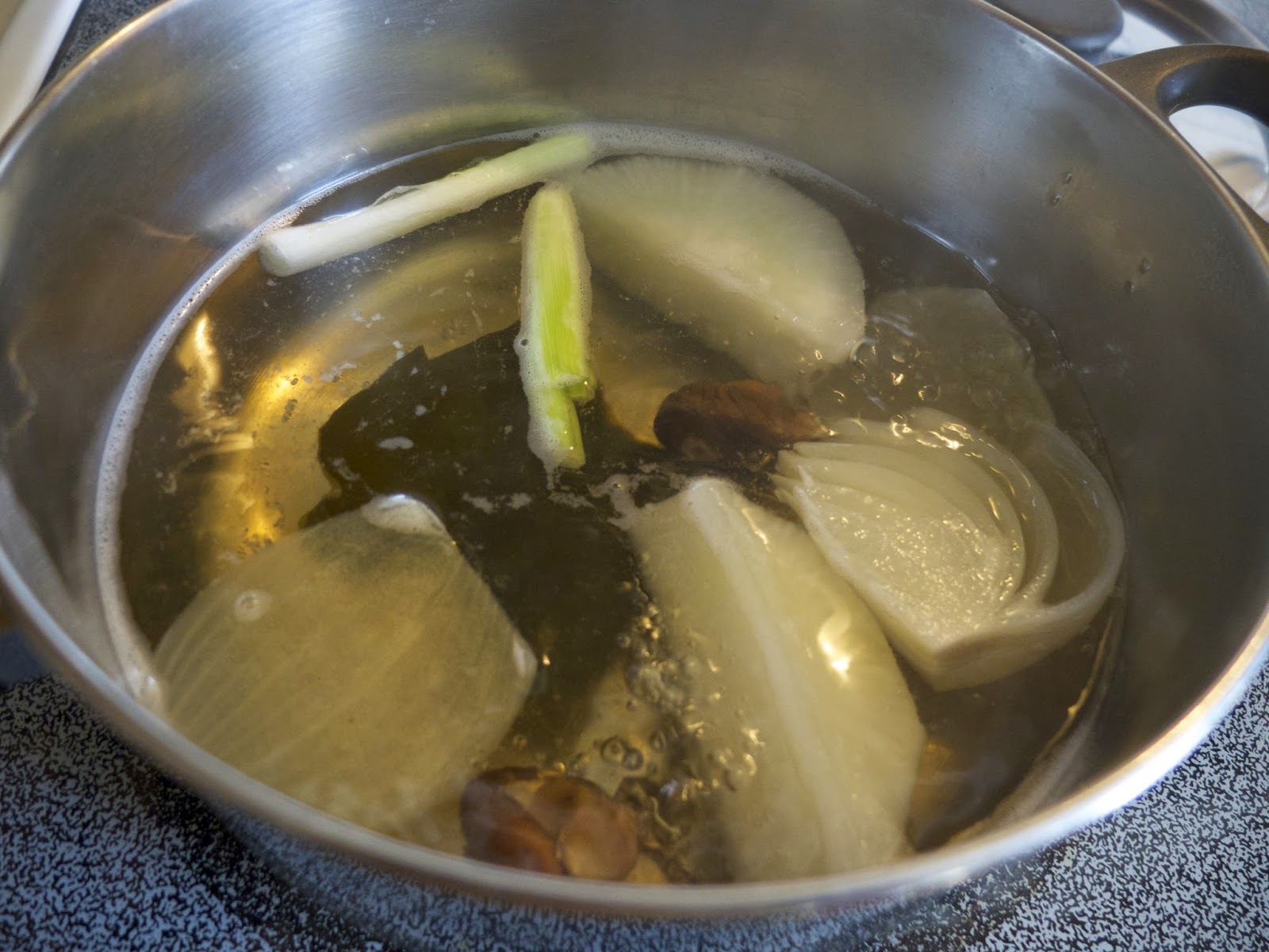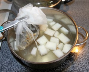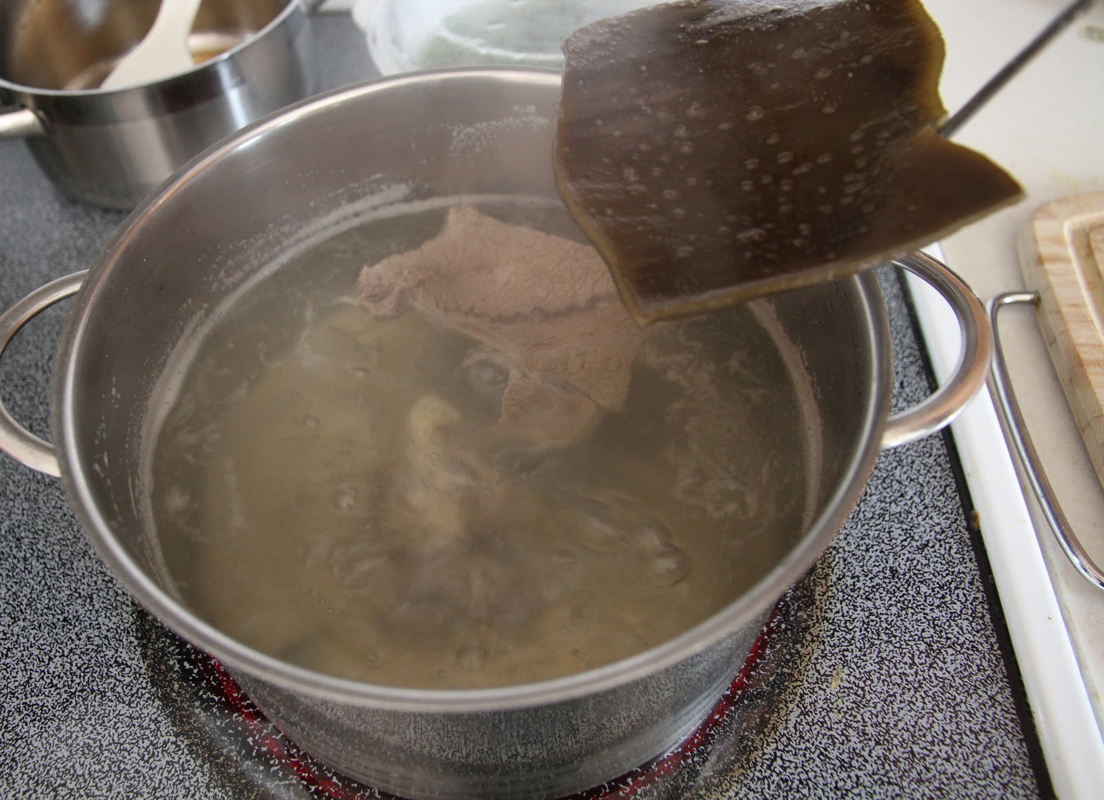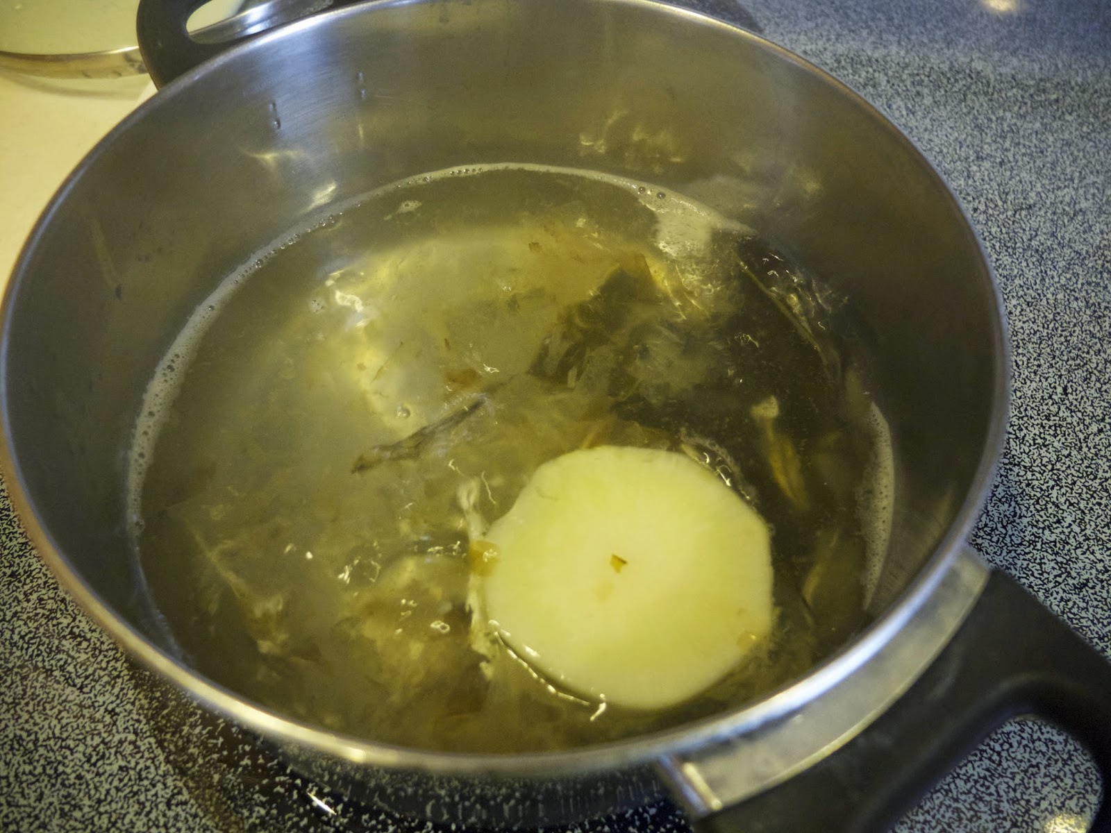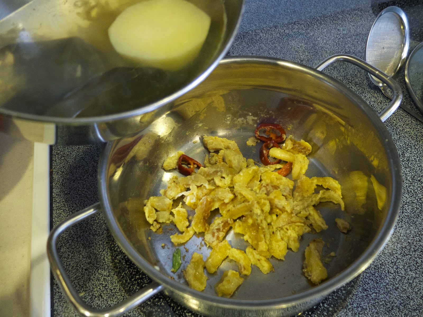 Nước xương sau khi hầm 2 tiếng thì vớt bỏ gừng, hành tây, nấm đông cô . Cho khoai tây và Rau khô dried cole vào. Đậy nắp nấu tiếp 15 phút.