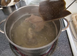 – 1 kg Xương heo rửa sạch, ngâm nước lạnh cho ra nước dơ và máu chừng 15 phút. Luộc sơ 5 phút qua một lần nước sôi cho ra bọt dơ. Rửa xương lại bằng nước lạnh. Rửa nồi sạch sẽ.