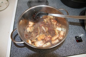 Sau 15 phút khi khoai vừa hơi mềm thì cho chén gia vị đã pha khi nãy vào nồi. Hầm tiếp 15 phút. Lúc này không cần đậy nắp.