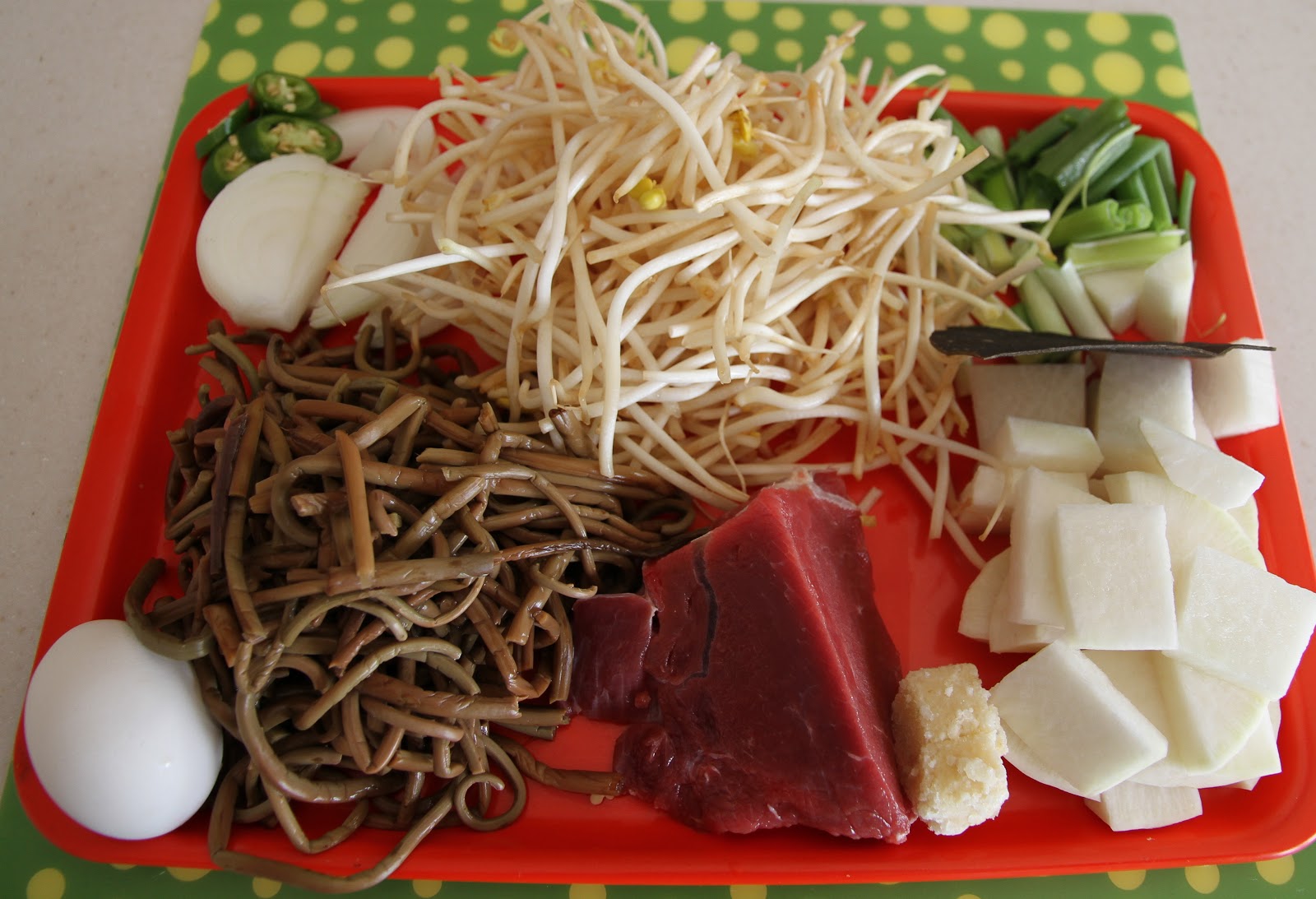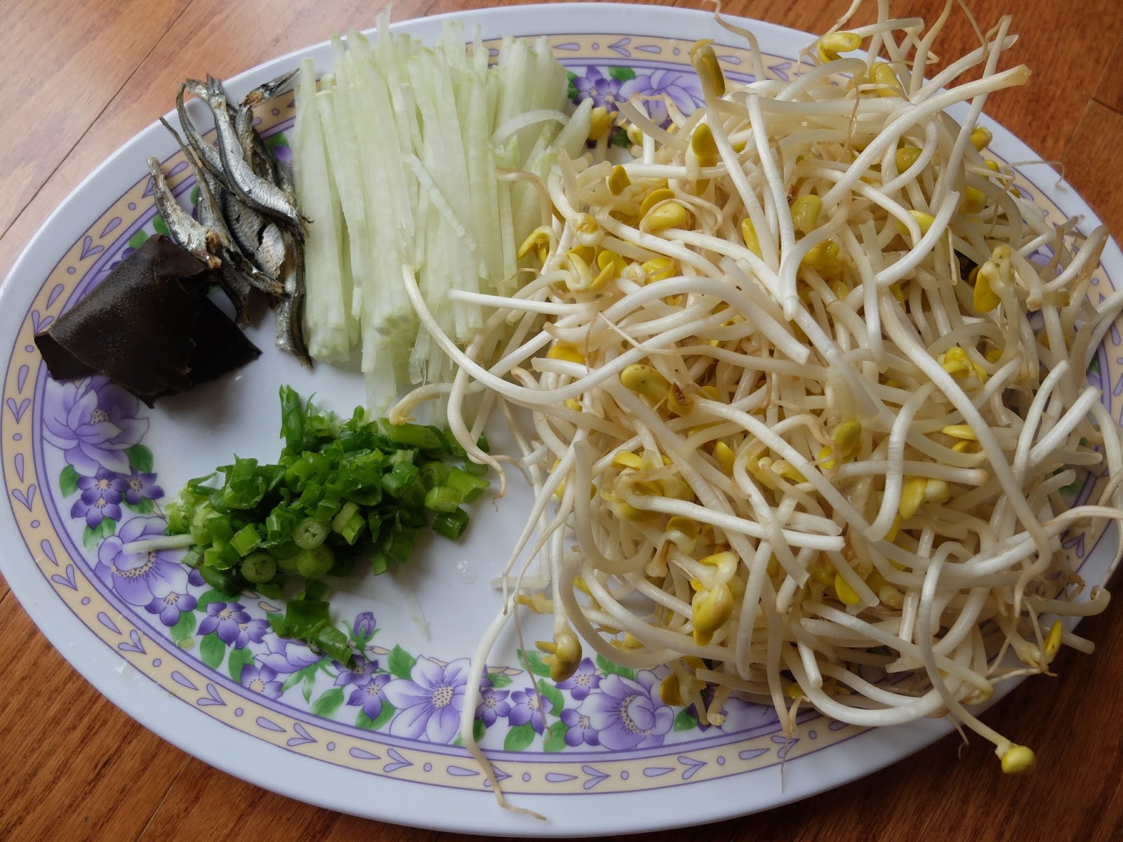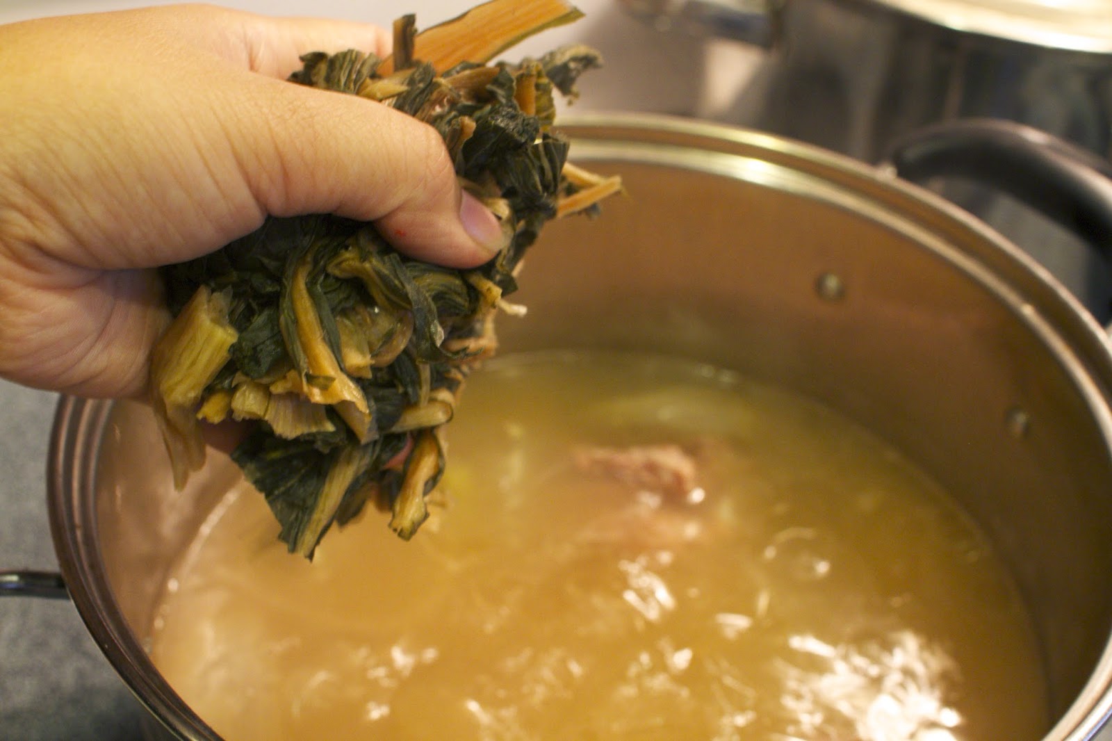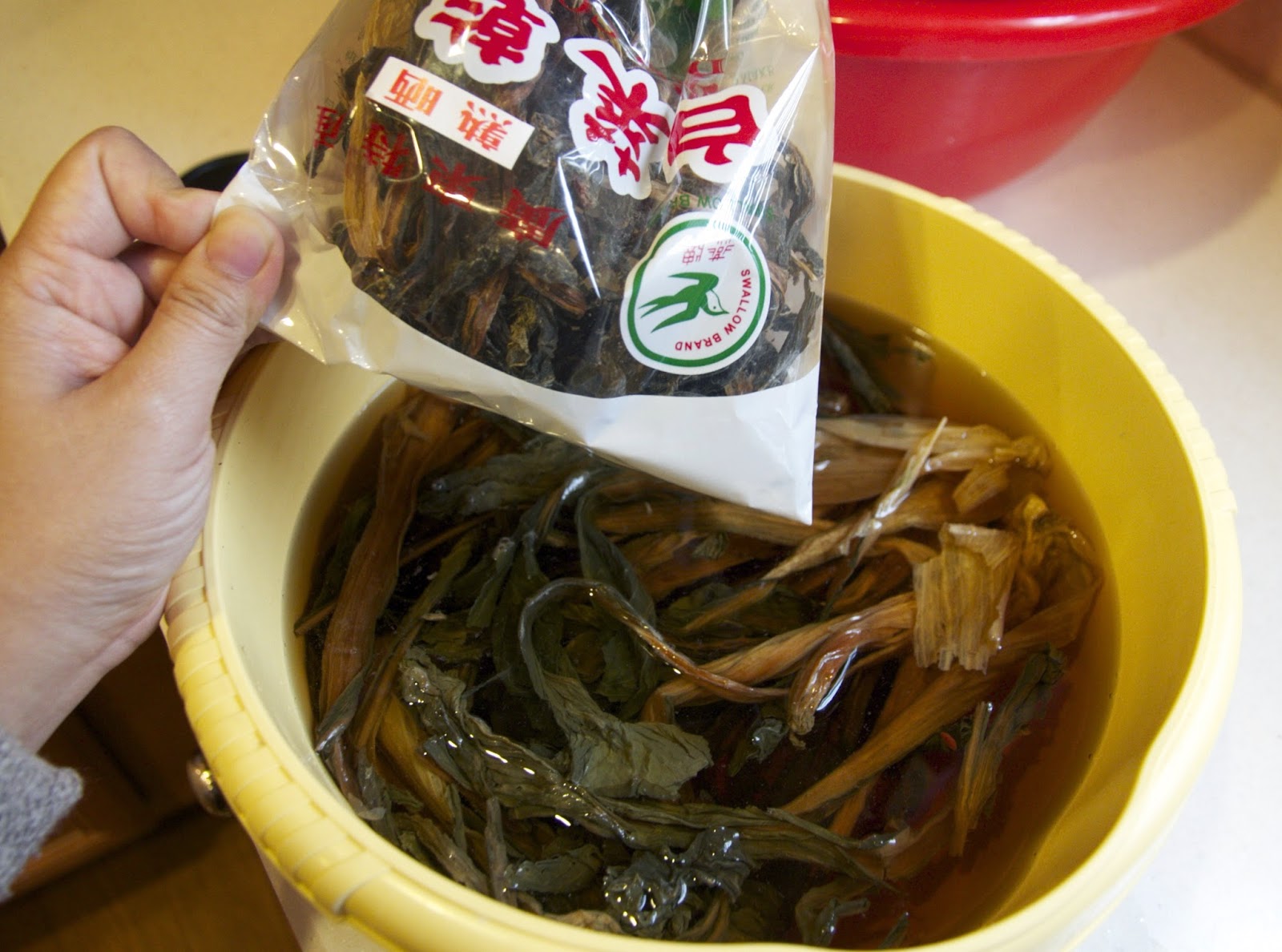 Rau 시래기 là một loai rau lá phơi khô. Có thể là phần lá của củ cải, hoặc phần lá già bên ngoài của cải thảo. Khi người HQ làm Kimchi cải thảo, những lá hơi già bên ngoài họ không vứt đi mà sẽ phơi khô ăn dần , cho vào những món canh. Bên Mỹ P kiếm được một loai rau khô của Tàu, không biết gọi là gì nhưng nấu lên ăn rất hợp và không bị lạc mùi. Ngoài bao bì tiếng anh họ ghi là Dried Cole. P dùng 7-8 nhánh, chừng nửa gói.