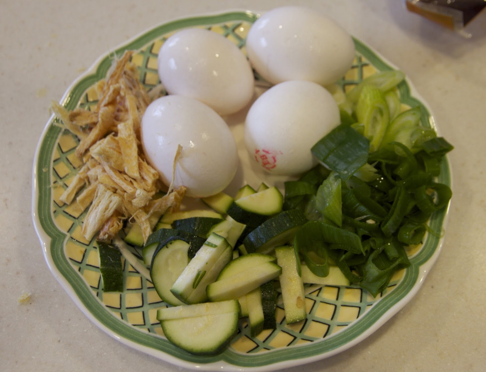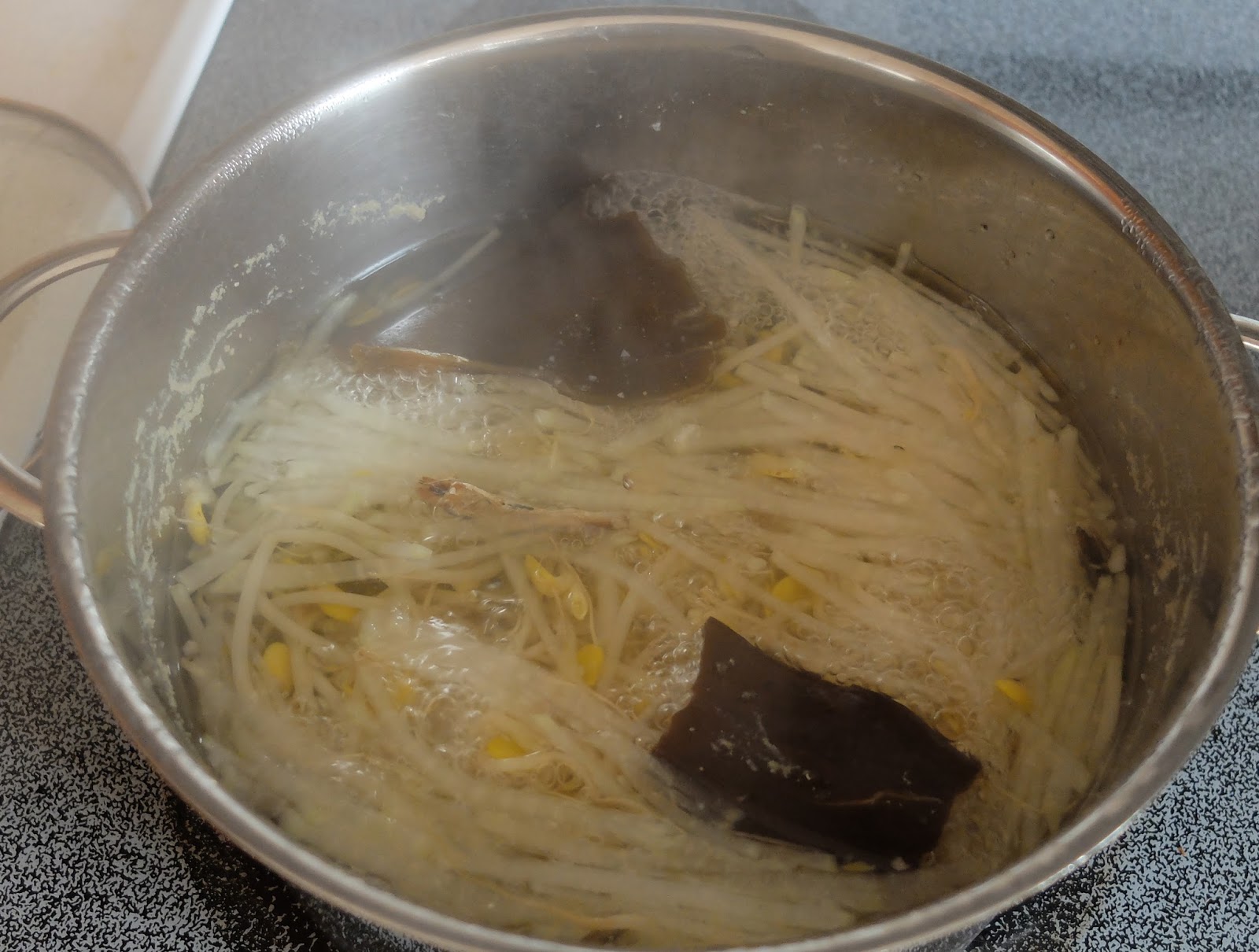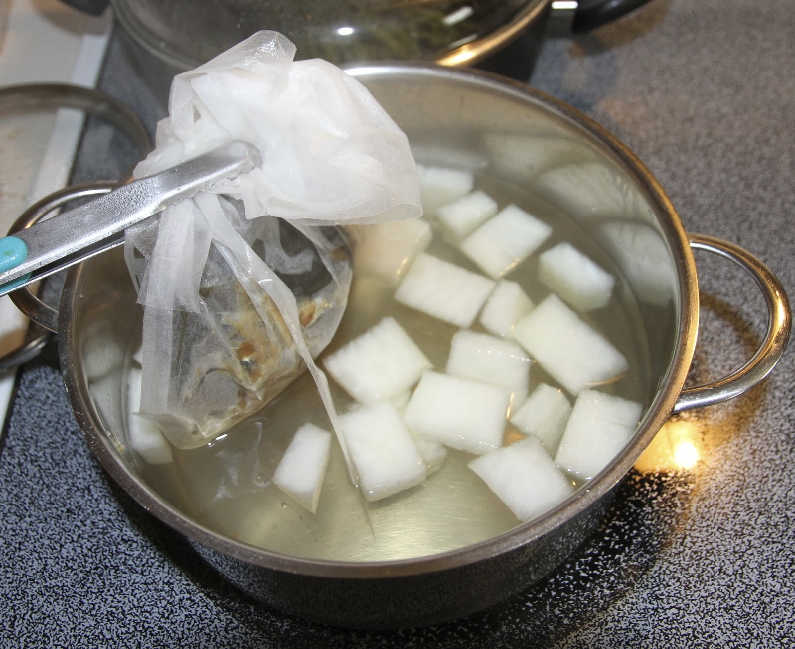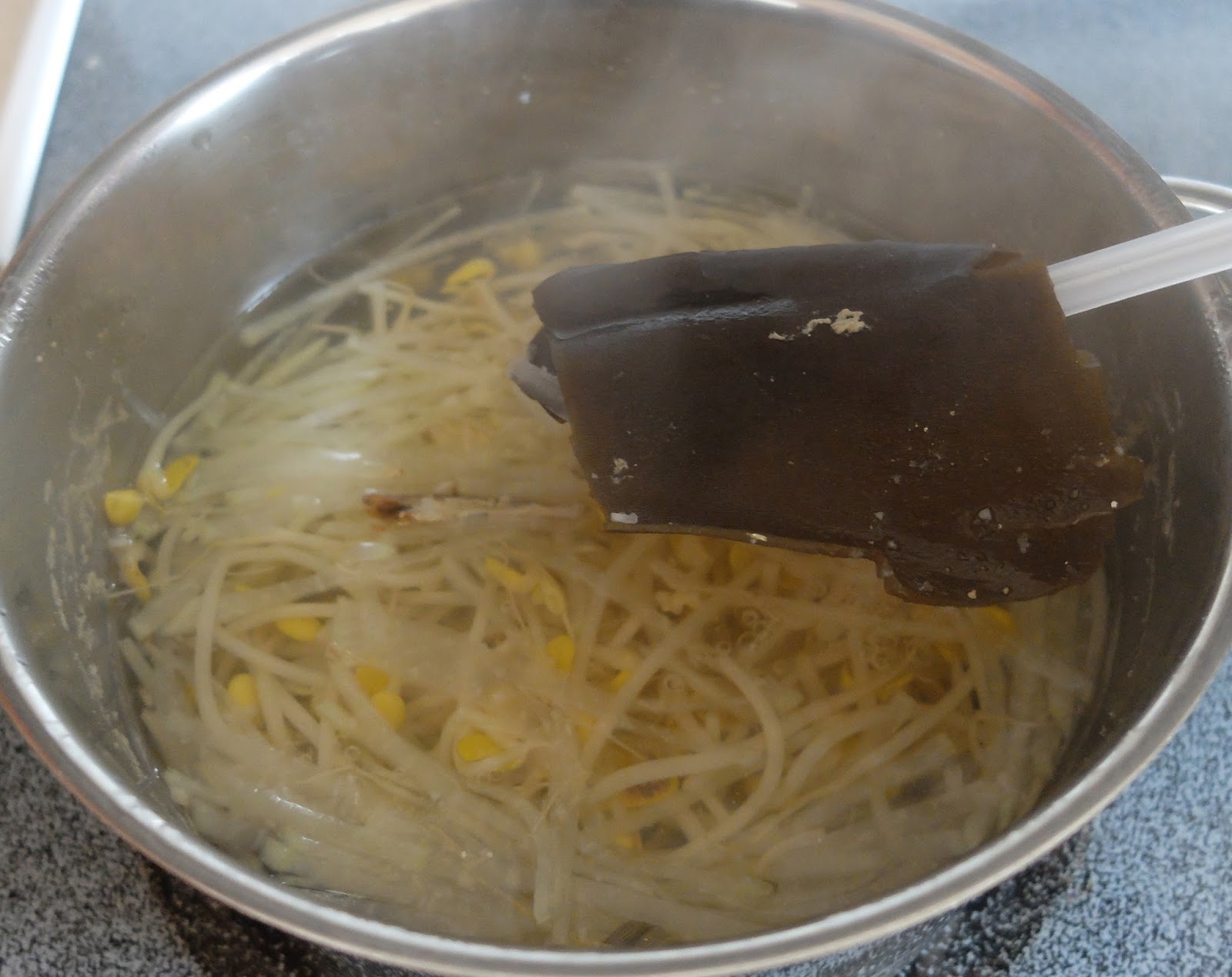 Rau 시래기 là một loai rau lá phơi khô. Có thể là phần lá của củ cải, hoặc phần lá già bên ngoài của cải thảo. Khi người HQ làm Kimchi cải thảo, những lá hơi già bên ngoài họ không vứt đi mà sẽ phơi khô ăn dần , cho vào những món canh. Bên Mỹ P kiếm được một loai rau khô của Tàu, không biết gọi là gì nhưng nấu lên ăn rất hợp và không bị lạc mùi. Ngoài bao bì tiếng anh họ ghi là Dried Cole. P dùng 7-8 nhánh, chừng nửa gói.