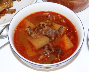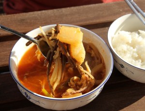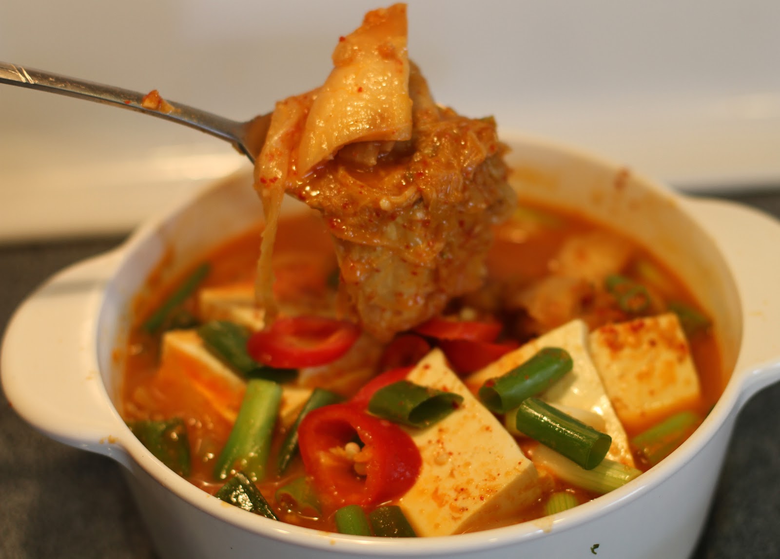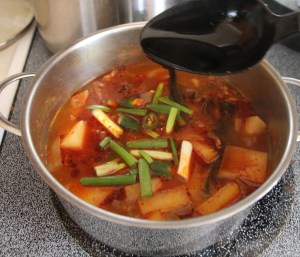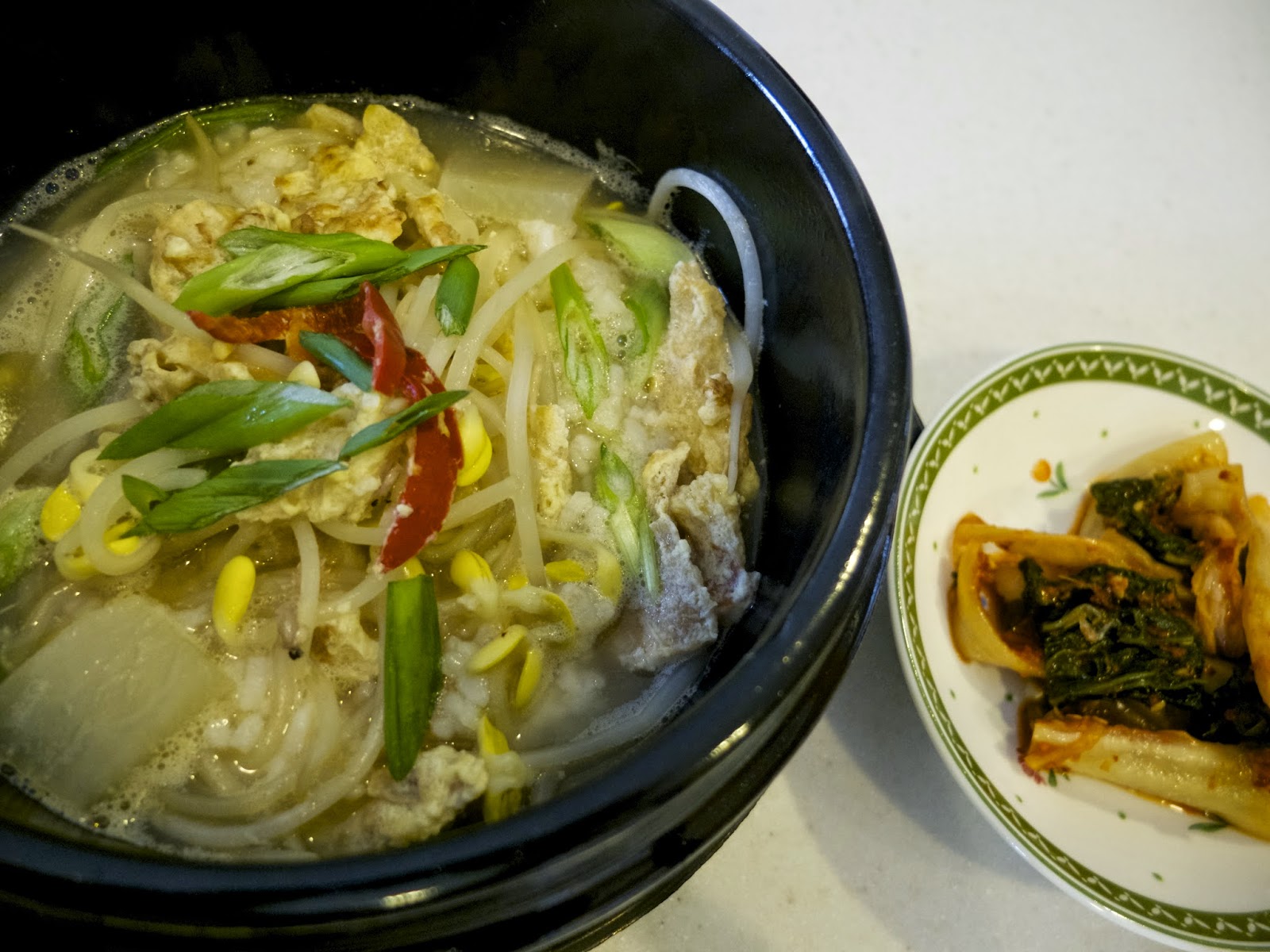 Đây là một món yêu thích của người HQ . Còn gì bằng xì xụp thưởng thức món canh nóng hổi đậm đà hương vị này nhất là vào khí trời mùa đông giá lạnh. Khi vào quán, chủ quán có thể bưng một khay to như nồi lầu sôi sùng sục lên đặt giữa bàn. Thực khách sẽ tự múc ra chén riêng thưởng thức. Hoặc bạn có thể yêu cầu một tô nhỏ cho một người ăn, chủ quán sẽ bưng ra một tô nhỏ bằng sành màu đen , nên sẽ giữ nhiệt cho món ăn rất lâu. Người Hàn thường úp nguyên chén cơn trắng vào tô canh , trộn lên và ăn kèm với các loại kimchi thật chua cay.