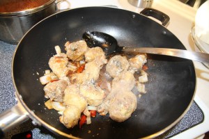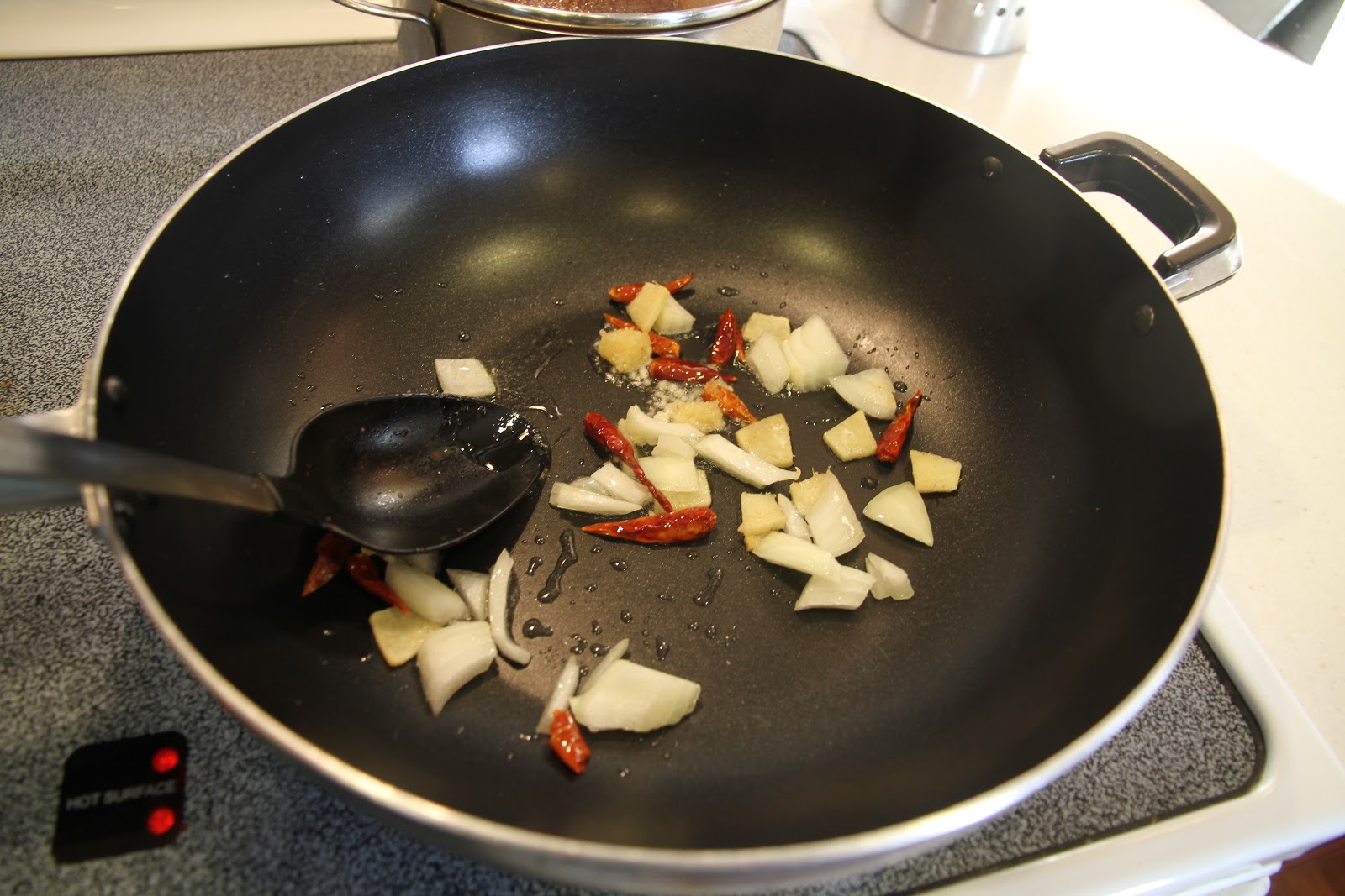 4. Bắc chảo, cho hai muỗng canh dầu ăn, cho ớt khô vào xào cho dậy mùi thơm và ra màu dầu ớt. Cho thịt gà đã ướp vào xào