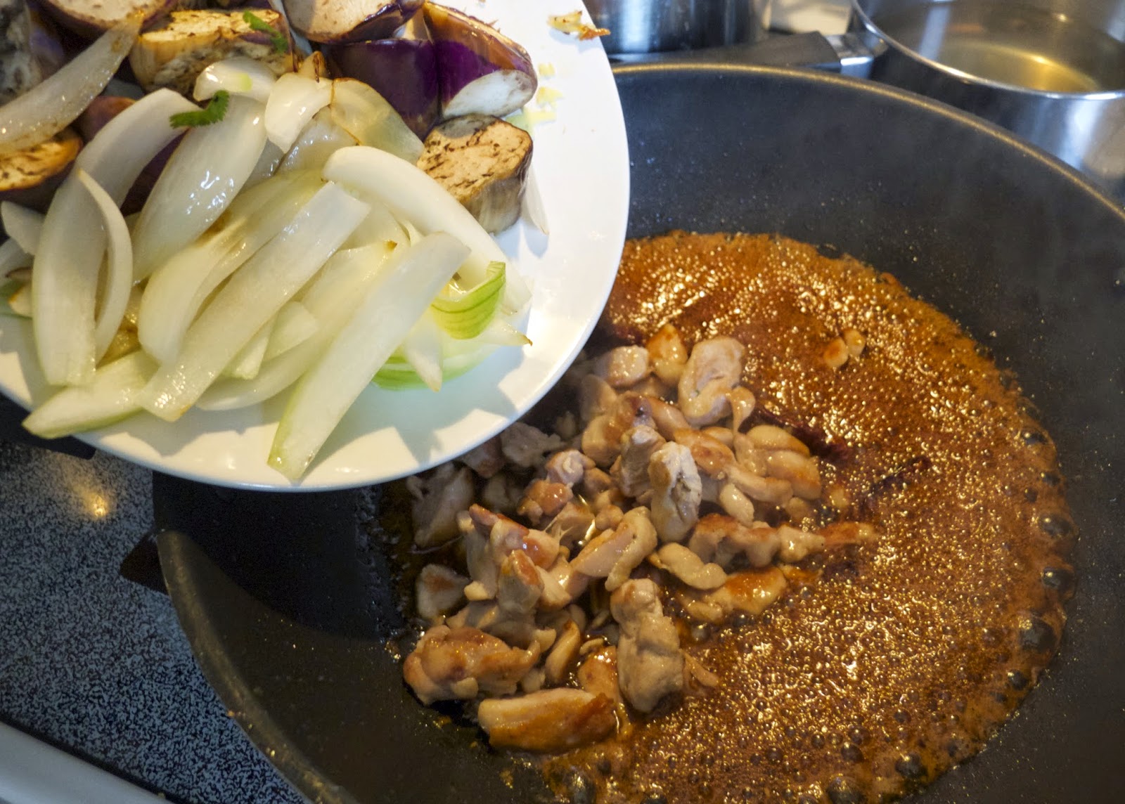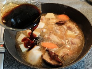 6. Cho nước 500ml nước dùng gà vào chảo thịt. Đậy nắp nấu riu riêu 10 phút thì cho hổn hợp nước sốt tương đã pha khi nãy vào nấu tiếp 15 phút. Lúc này không cần đậy nắp.