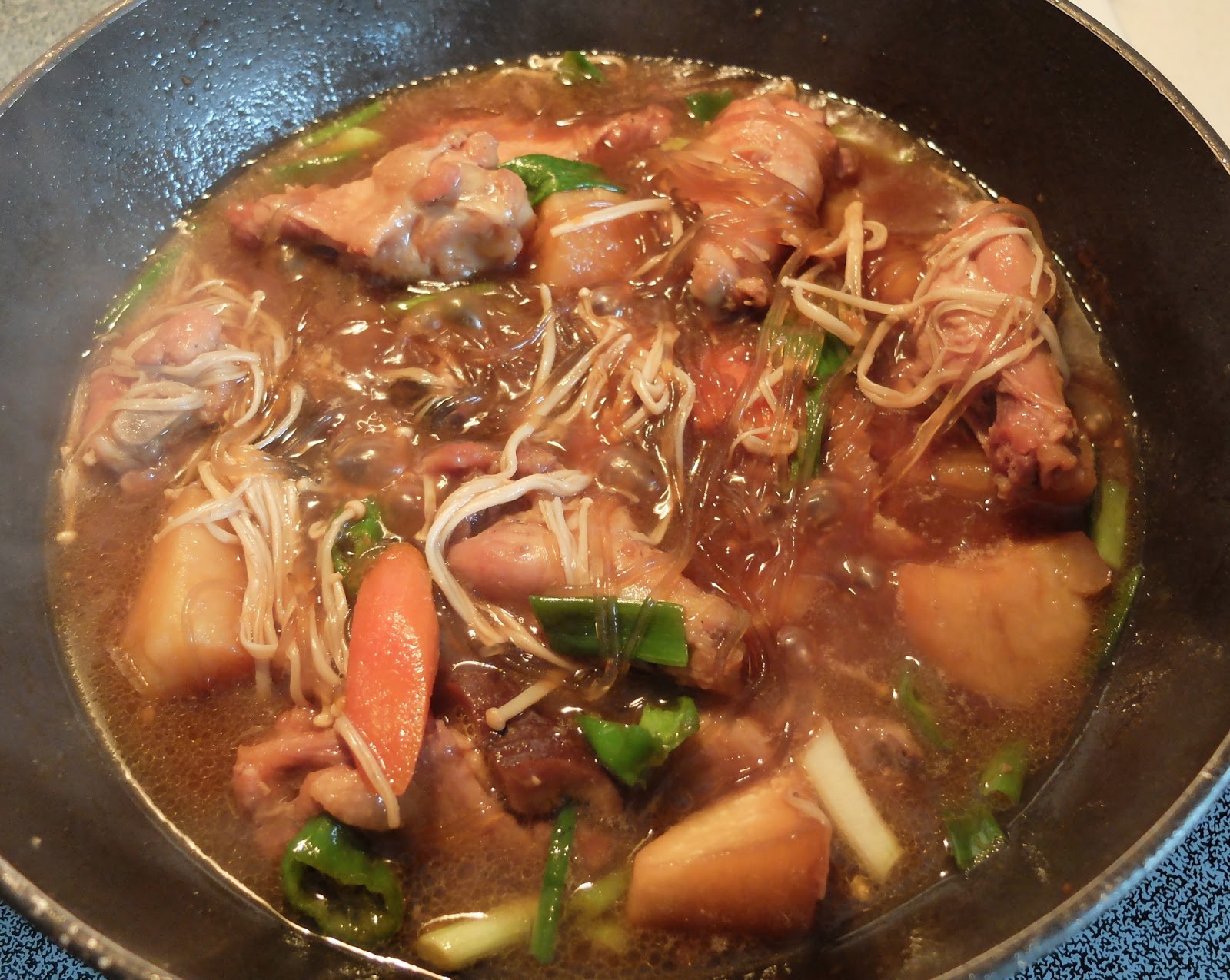 7. Gà và Rau củ sau khi nấu tổng cộng 25-30 phút thì lúc này mới cho nấm Enoki, miến Chapche, Ớt sừng, hành lá. Không đậy nắp nấu tiếp 10 phút lửa vừa. Sau đó tắt lửa, bắc xuống cho ra dĩa, rắc mè rang. XONG!